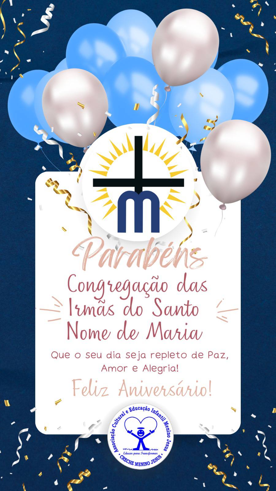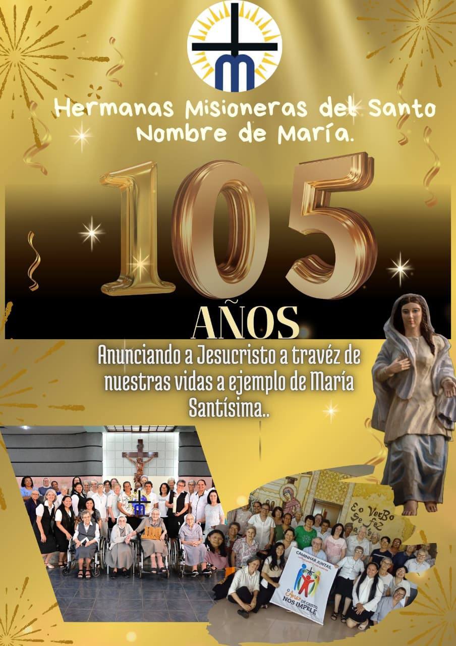 Neste dia 25 de março de 2025, dia da Solenidade da Anunciação do Senhor, nossa Congregação está em festa pelos seus 105 anos de Fundação e também pelos 75 anos de Vida Religiosa Consagrada da Irmã M. Johannita e da Irmã M. Dolores. Por isso, com muita alegria e gratidão a Deus nos unimos a todas as Irmãs e Leigos Missionários do Santo Nome de Maria para celebrar esse dia tão especial. Nosso coração louva e agradece a Deus pelos 105 anos de História, vidas doadas, evangelização, bênçãos e sem dúvida também muitas lutas e desafios. "Até aqui, o Senhor nos conduziu. E, certamente, daqui pra frente ele nos conduzirá."