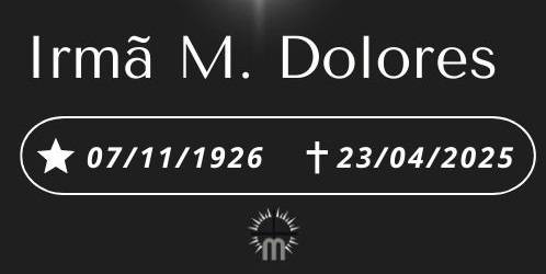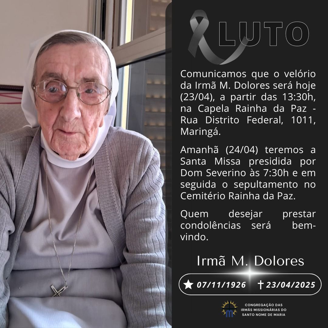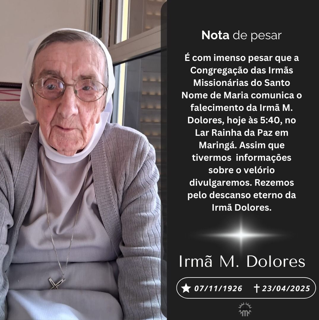 Ir. M. Dolores, foi para casa do Pai, no dia 23 de abril de 2025, as 5:40h enquanto rezávamos as Laudes com ela. Após sua queda e fratura, mesmo passando por uma cirurgia, não conseguiu restabelecer sua saúde até sua morte, foram 52 dias em seu leito, momento de lucides e momentos de inquietação, recebendo todos os cuidados e afetos das irmãs e cuidadoras. Gratidão a essa religiosa, que amou e que agora intercede por nós.
